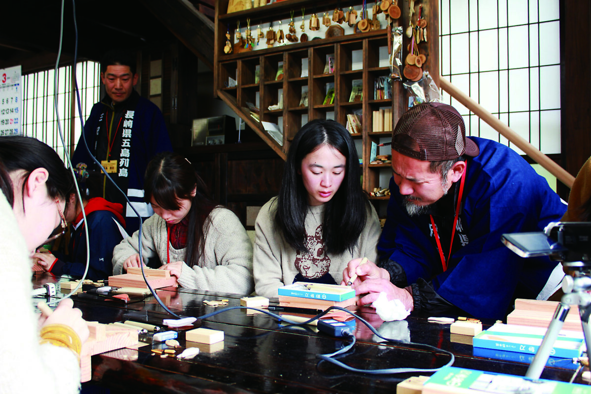 - 奈留島にある、本業は大工さんの葛島三兄弟が営む三兄弟工房で木工体験を行います。