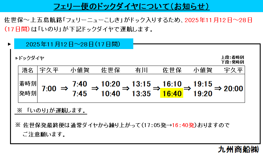 - 11月12日~28日【フェリーニューこしき】(佐世保~上五島 フェリー)