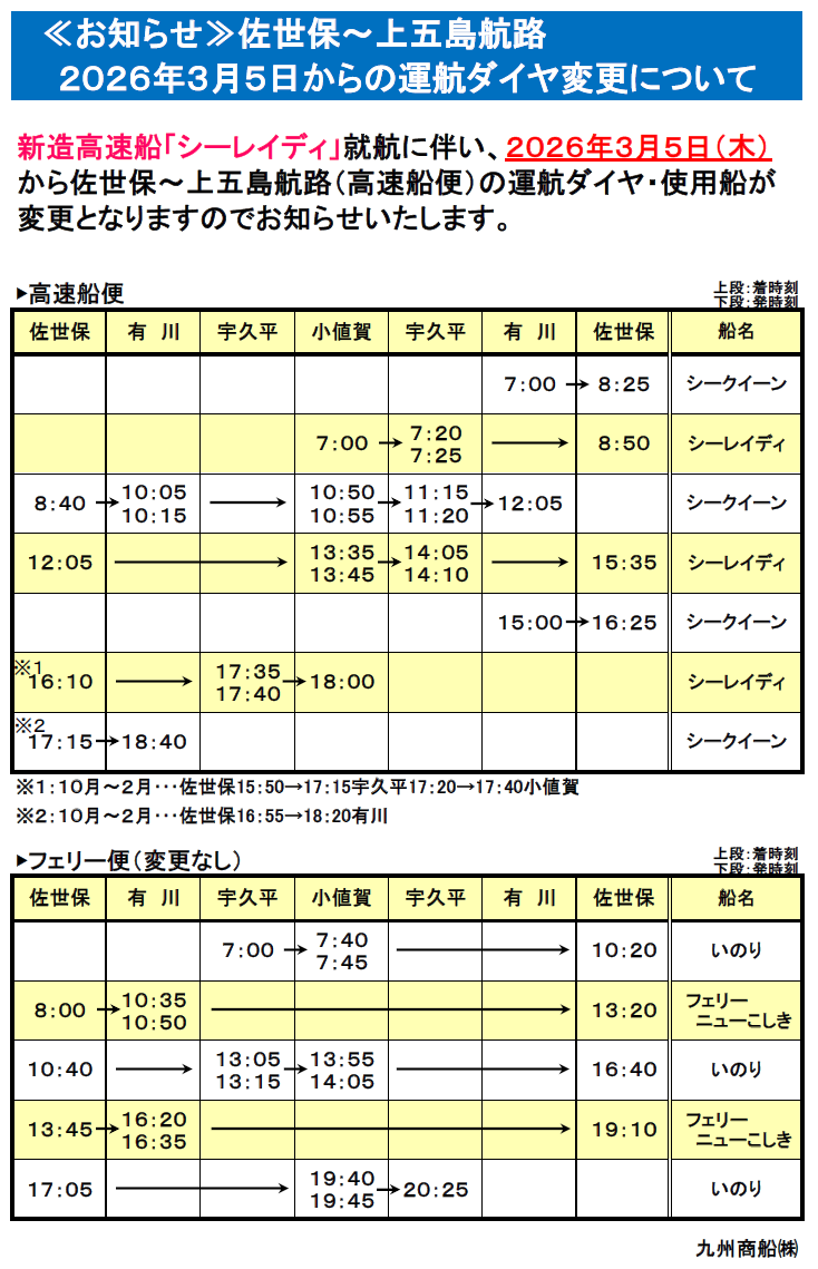 佐世保~上五島航路「シーレイディ」の就航および運航ダイヤ変更について